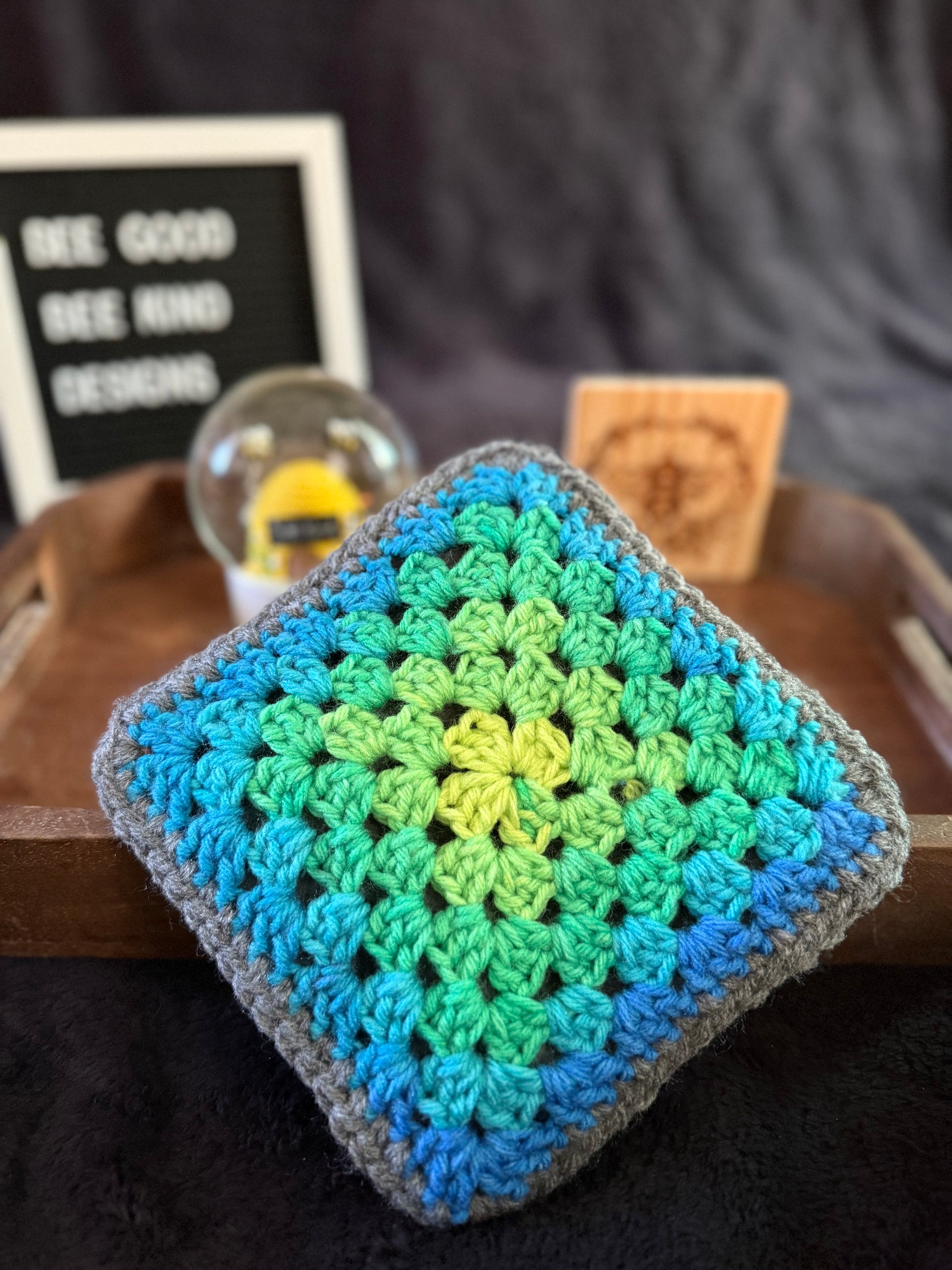 These gorgeous granny square coasters are vibrant with colors that evoke the beauty of nature, like waves meeting the forest.
